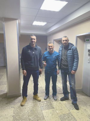 Dr. Vladimir Novikov (M.), Freund von Dr. Oleg Yastrebov, bekam in der unterstützten Mediland Klinik in Kiew Besuch von Dr. Wladimir und Vitali Klitschko (r.).