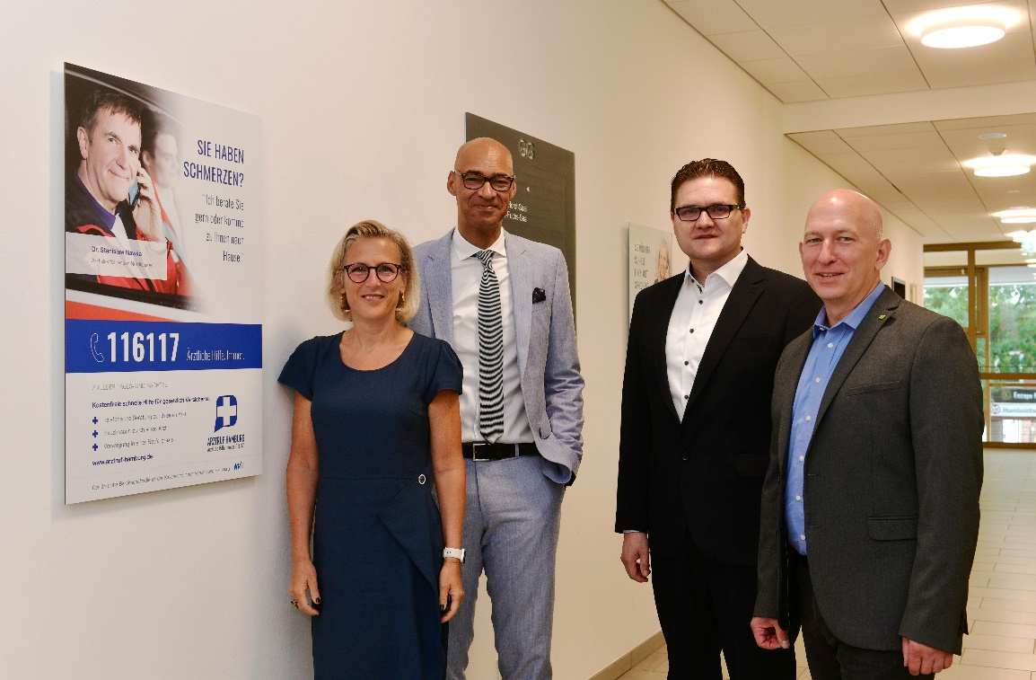 Von links: Caroline Roos (stellvertretende Vorstandsvorsitzende der Kassenärztlichen Vereinigung Hamburg), John Afful (Vorstandsvorsitzender der Kassenärztlichen Vereinigung Hamburg), Sven Horstmann (Geschäftsführer der WISAG Sicherheit & Service Nord), Christoph Lippay (Leiter Vertrieb der WISAG Sicherheit & Service Region Nord)