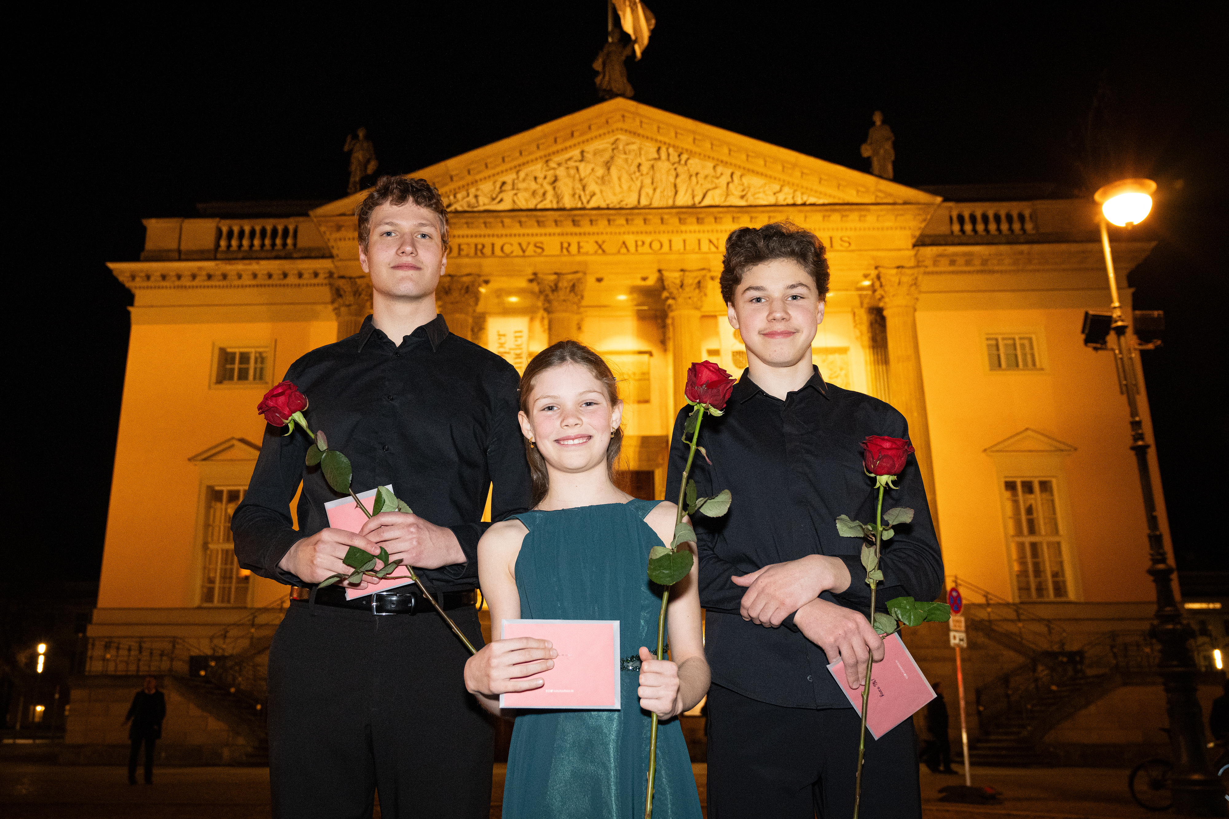 - Maria Lange (Mitte), Louis Sturm (links) und Rocco Pfeil vor der Staatsoper Unter den Linden. Der Dussmann-Musikwettbewerb bietet die Möglichkeit, außerhalb der Schule und vor großem Publikum aufzutreten.