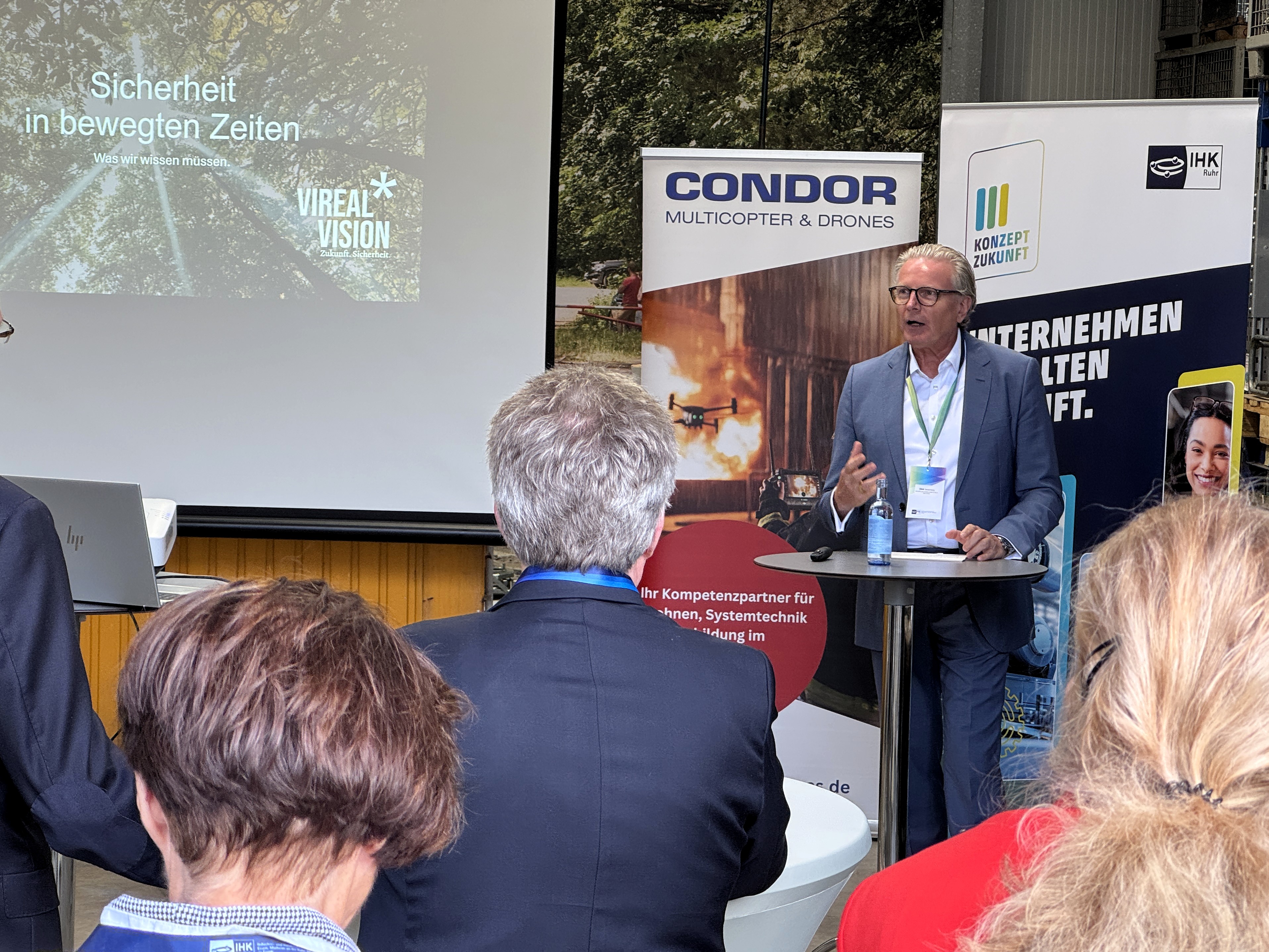 Gastgeber Cornelius Toussaint, geschäftsführender Gesellschafter der CONDOR-Gruppe und BDSW-Vizepräsident, ging in seinem Eingangsstatement auf die Chancen und Risiken moderner Technologien ein – insbesondere auf Künstliche Intelligenz (KI) und Drohnentechnologie. Als Entwickler und Hersteller von Drohnen mit über zwölf Jahren Erfahrung betonte er: „Ein holistisches Sicherheitskonzept muss auch die Bedrohung aus der dritten Dimension abdecken.“ Die wachsende Drohnenaktivität im Umfeld Kritischer Infrastrukturen – gerade seit Beginn des Angriffskrieges Russlands auf die Ukraine – zeige den Handlungsbedarf auch in Deutschland, nicht nur für die Cyber-Sicherheit. Nachholbedarf sieht Toussaint im Bereich Drohnen-Awareness und Sicherheitsmanagement für die deutsche Wirtschaft.