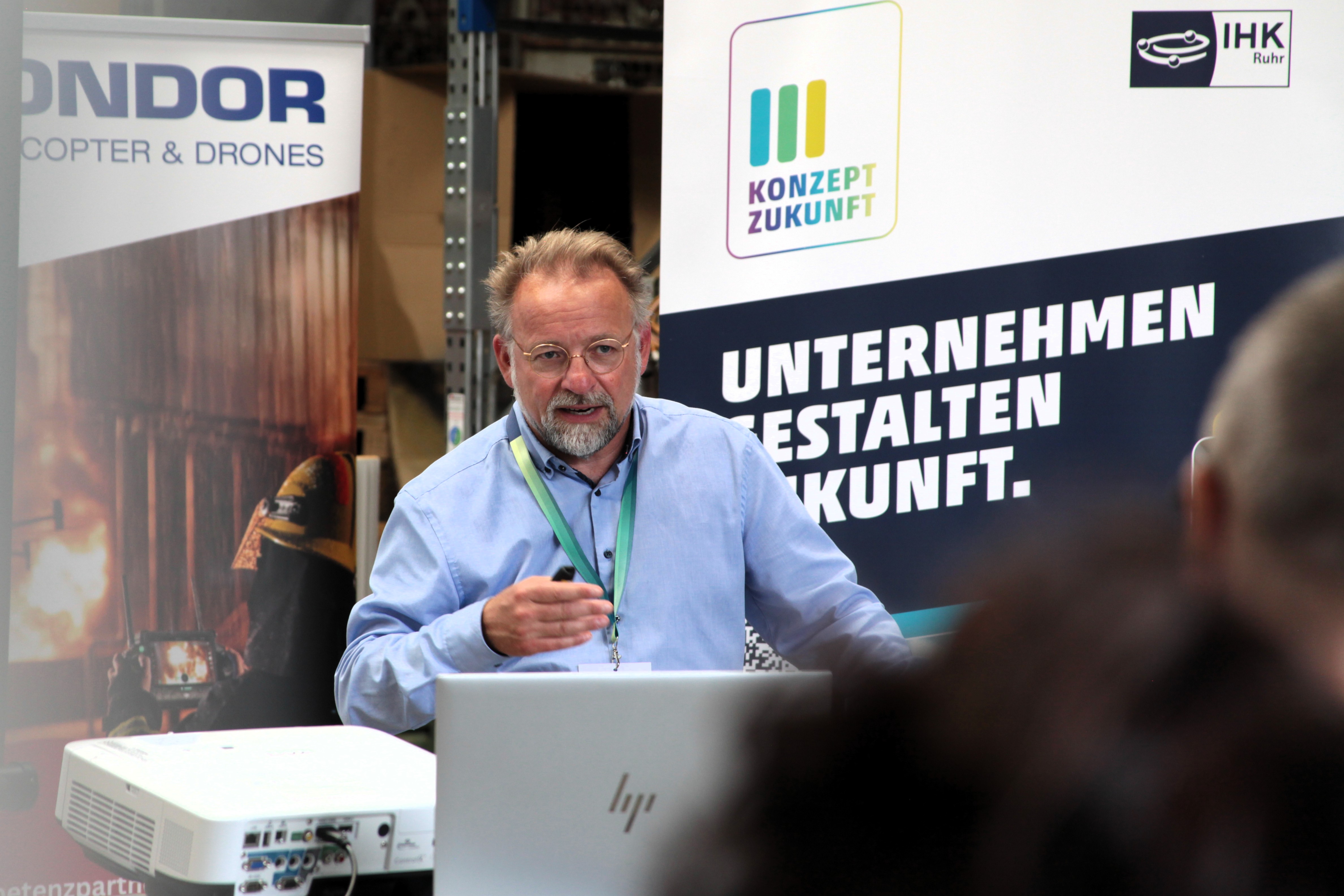 Cornelius Toussaint bot den Teilnehmenden des Netzwerks Zukunft MEO unerwartete Einblicke in die Nutzung von Drohnen im Rahmen der Sicherheitswirtschaft. Dabei betonte er, dass Drohnen Chancen und Risiken in sich bergen, die es grundsätzlich in modernen Sicherheitskonzepten zu bedenken gilt.