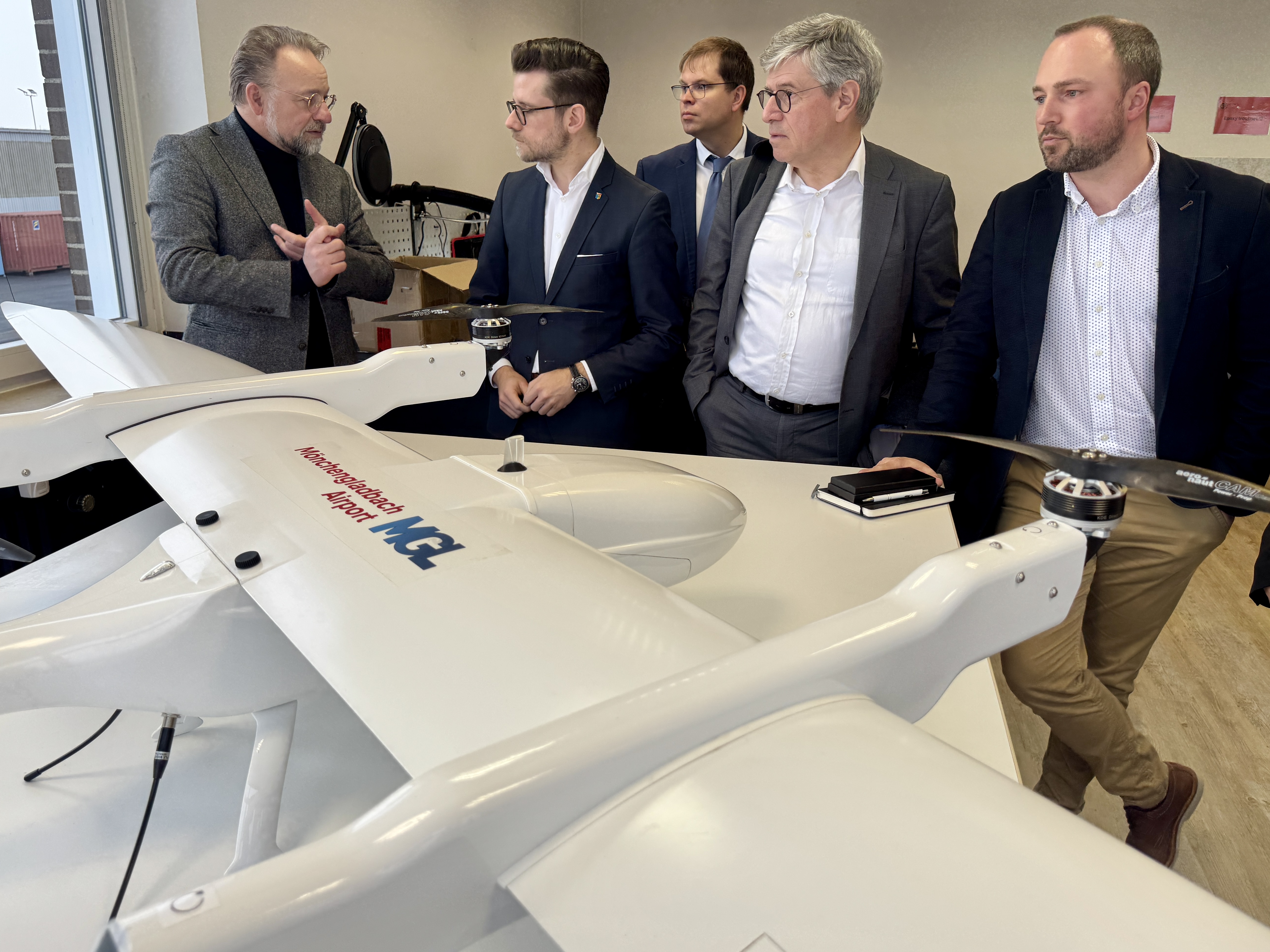 Cornelius Toussaint (l.) ist CFO von Germandrones und stellt beim Besuch von Oberbürgermeister Felix Heinrichs (2.v.l.) den Produktionsstandort am Flughafen Mönchengladbach sowie die Flächenflügler-Drohne Songbrid vor.